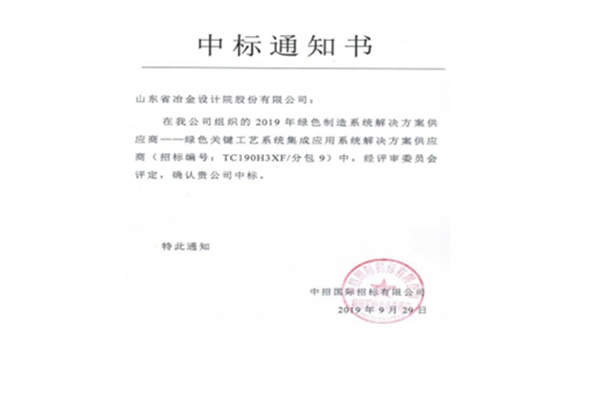 近日,在中華人民共和國工業(yè)和信息化部節(jié)能與綜合利用司2019年綠色制造系統(tǒng)解決方案供應(yīng)商招標(biāo)中,公司中標(biāo)綠色關(guān)鍵工藝系統(tǒng)集成應(yīng)用系統(tǒng)解決方案供應(yīng)商。