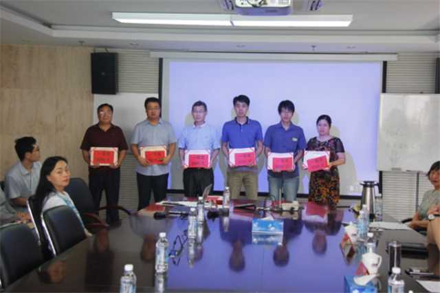 公司董事長魏新民、總經(jīng)理衣忠德給一等獎(jiǎng)?wù)撐淖髡哳C發(fā)榮譽(yù)證書及獎(jiǎng)勵(lì)。