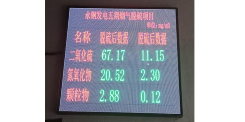 公司EPC總承包的聯(lián)峰鋼鐵有限公司電力廠5#煙氣脫硫項(xiàng)目自投運(yùn)以來,通過對(duì)鍋爐煙氣脫硫前后參數(shù)的采集與對(duì)比,對(duì)脫硫劑小蘇打的噴吹量實(shí)現(xiàn)自動(dòng)調(diào)節(jié),經(jīng)過一個(gè)月的調(diào)試,除塵器出口煙氣含塵顆粒物、SO2,氮氧化物的含量均低于國(guó)家超低排放行業(yè)標(biāo)準(zhǔn),達(dá)到公司承諾運(yùn)行保證值,滿足性能考核要求。脫硫后的排放數(shù)據(jù)實(shí)時(shí)顯示到大屏,對(duì)外公布。